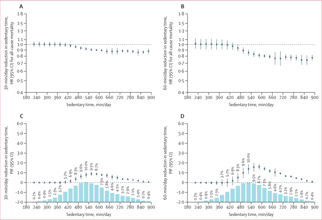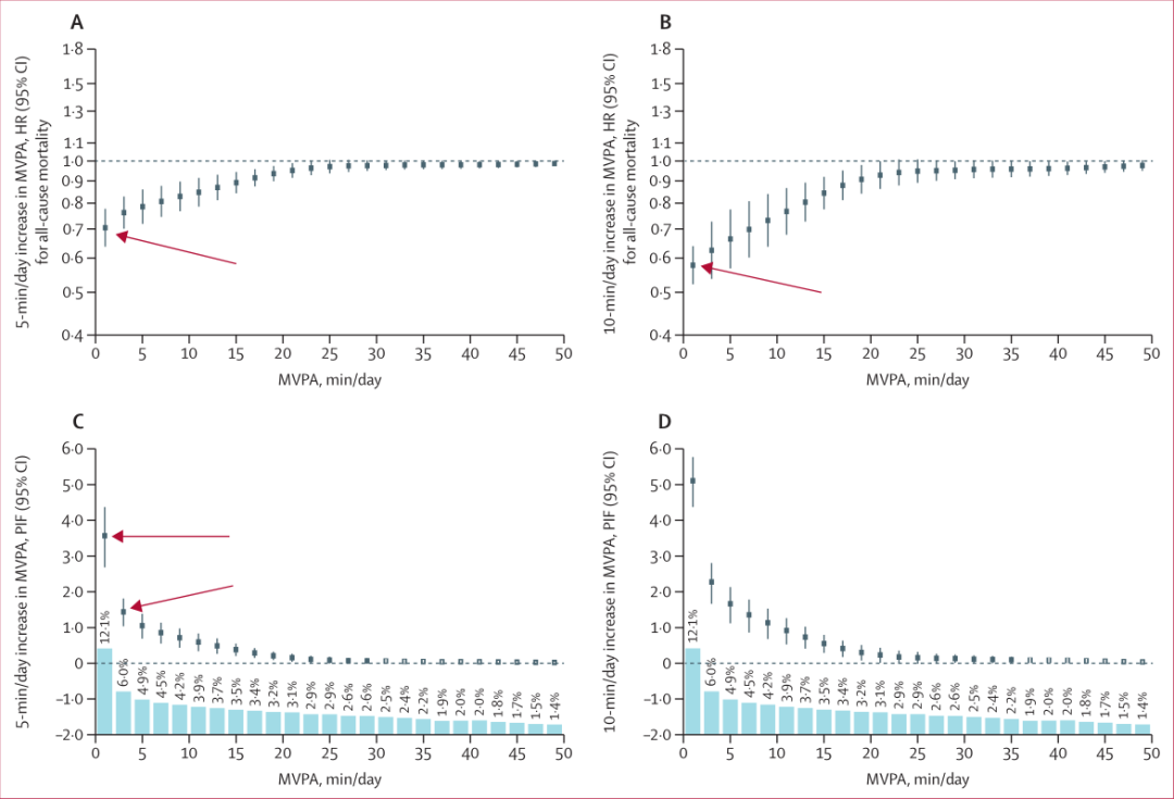 例如,中高强度身体活动从1分钟/天增加到5分钟至6分钟/天(图1A),死亡风险降低约30%;从1分钟/天增加10分钟至11分钟/天(图1B),死亡风险降低约42%。