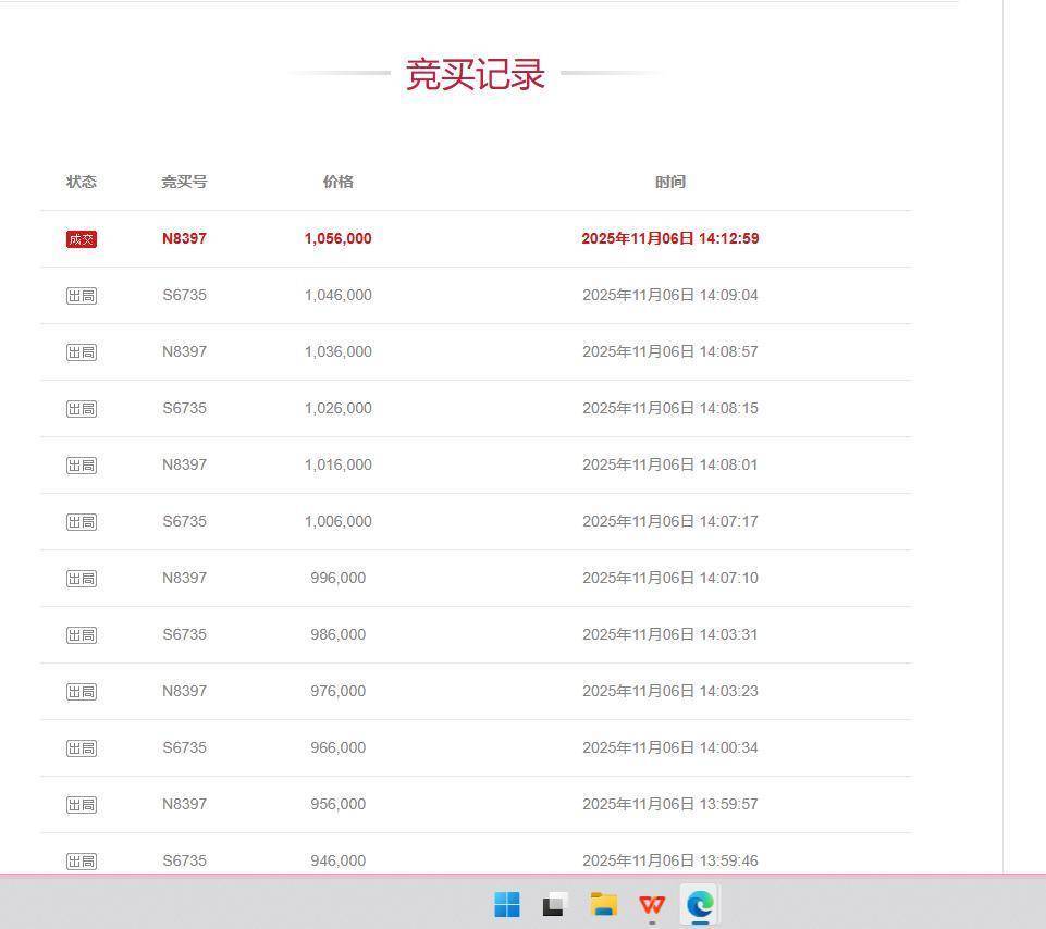 在竞拍最后半小时,就有14次出价,多位竞买人线上抢购。多番出价后,价格从92.6万一路涨到105.6万,突破百万大关。